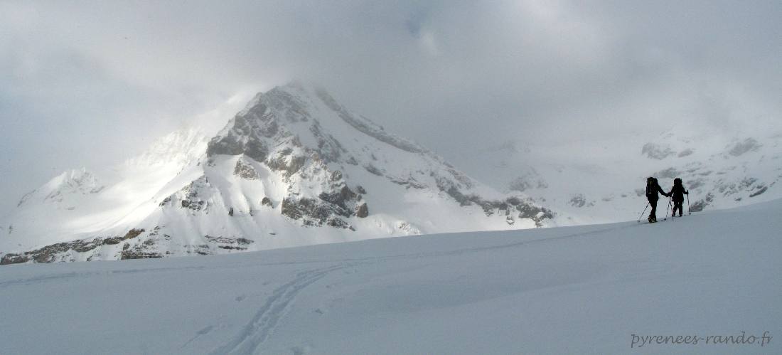 Nous sommes sur l'épaule menant à la longue traversée, la Dent Parrachée émerge lentement des brumes du matin.