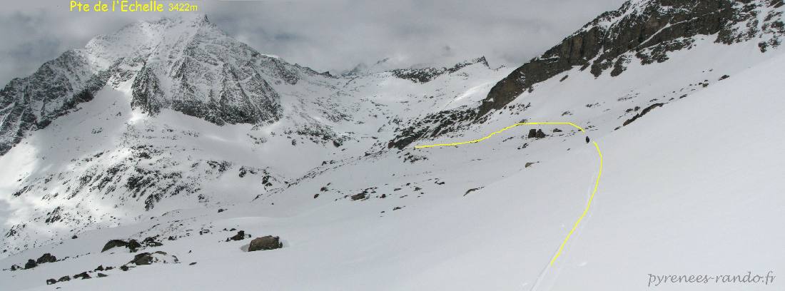 Descente du col de Labby avec la pointe de l'Echelle 3422m en face.