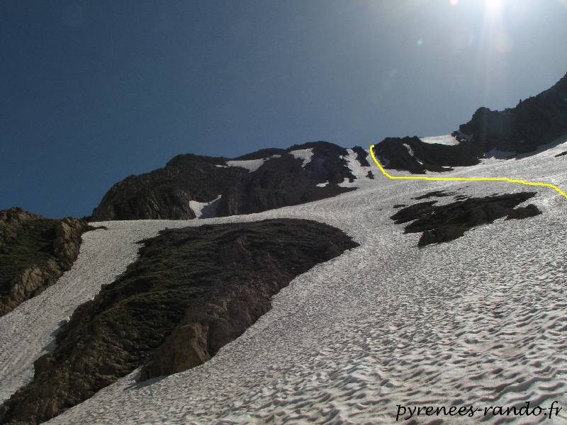 Je choisis le couloir du milieu pour atteindre la crête sommitale. La neige est limite crampons mais les Vibram accroche bien .