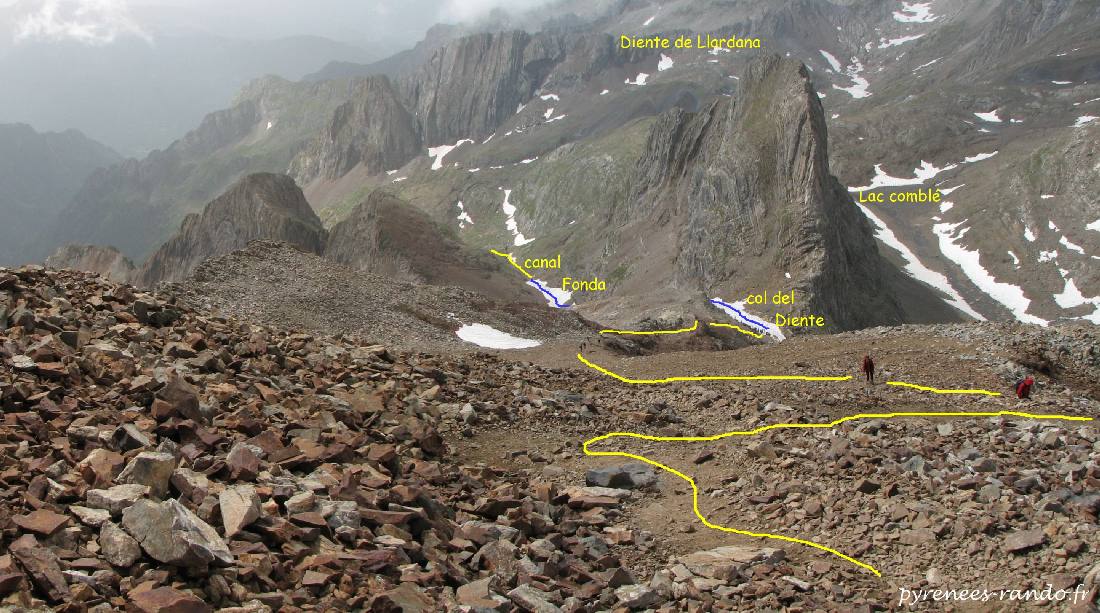 Pour la descente, suivre la crête sud pour atteindre le col "del Diente" au pied de las Diente de Llardana.