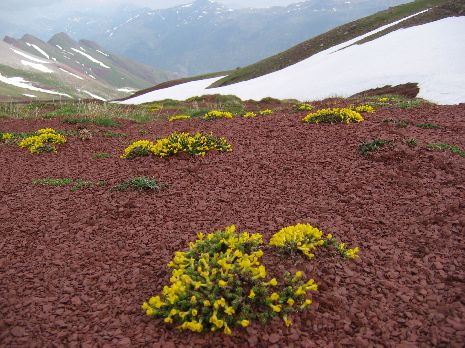 Quelques fleurs s'accrochent sur ces pierres rouges... au pied du Lañetera