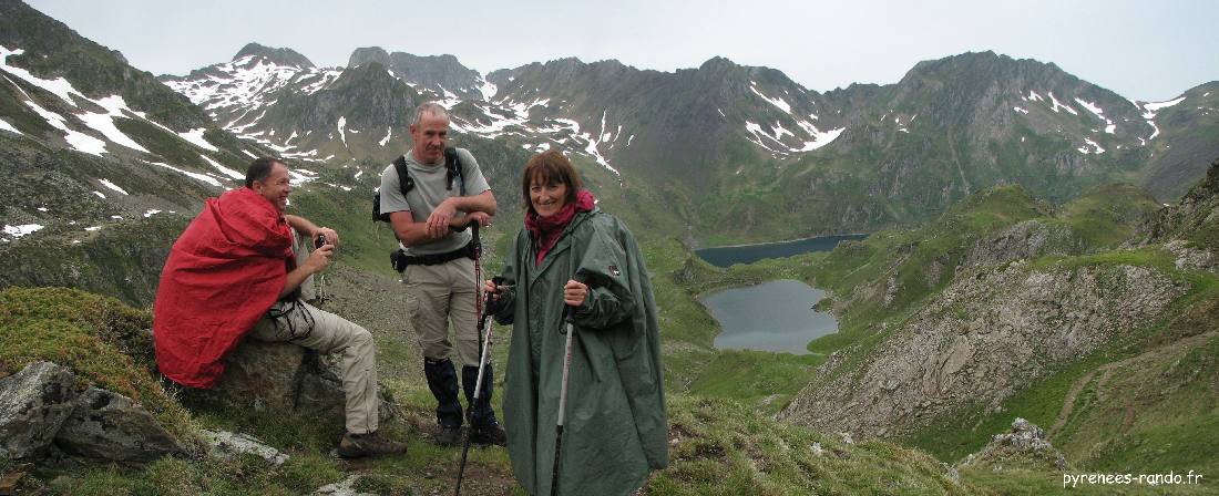 Nous sommes partis avec le soleil, mais une légère perturbation venant d'Espagne nous oblige à revêtir le poncho . En contrebas, le lac Vert et le lac Bleu.