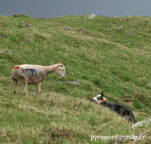 Les bergers montent les troupeaux pour l'été et le chien a fort à faire pour cadrer les brebis récalcitrantes.