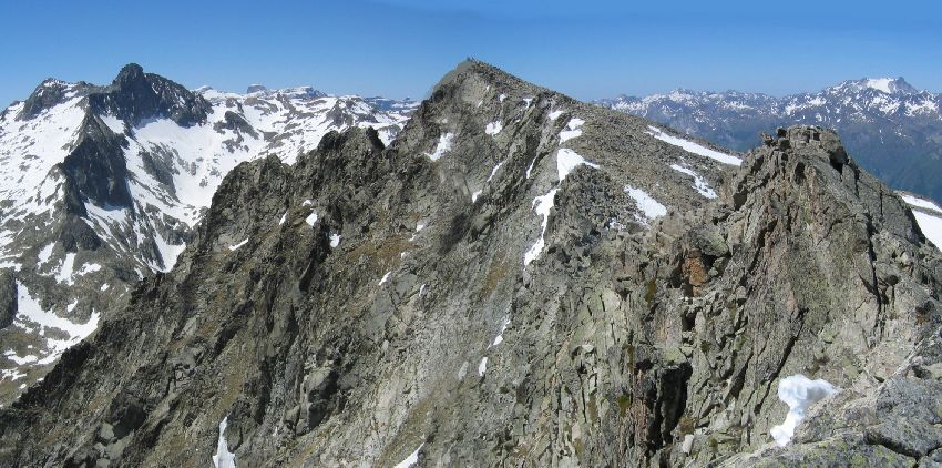 Le Turon de Néouvielle encadré par le pic Long et le Vignemale depuis l'arête des Trois Conseillers.