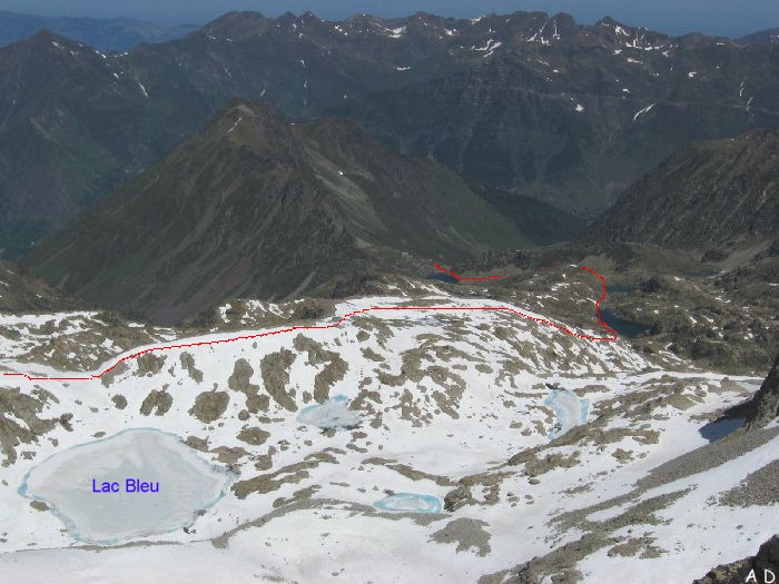Vue plongeante sur le cheminement de la montée depuis la Glère.