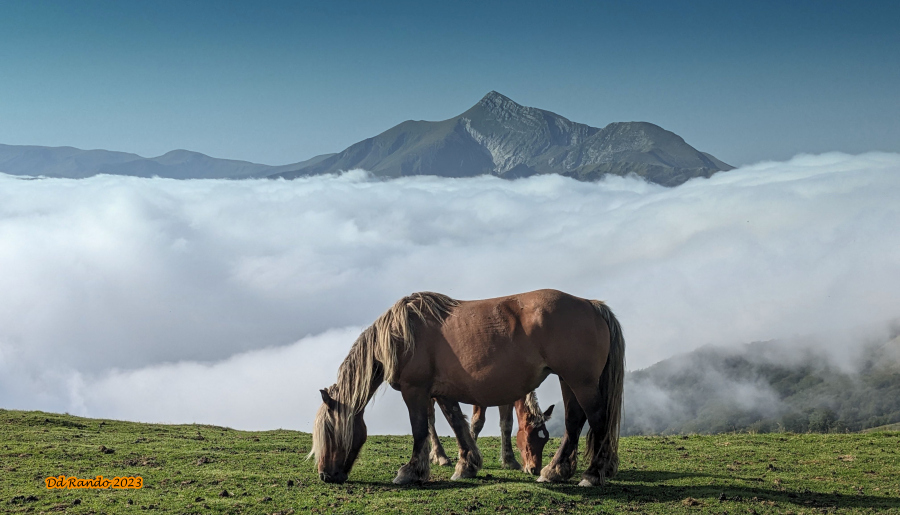 Jument et son poulain sur fond d'Orhy.