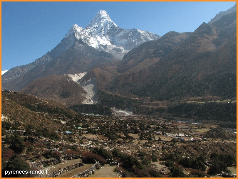 en fond et l'Ama Dablam, au pied, sur le plateau, Pangboché 3930m.
