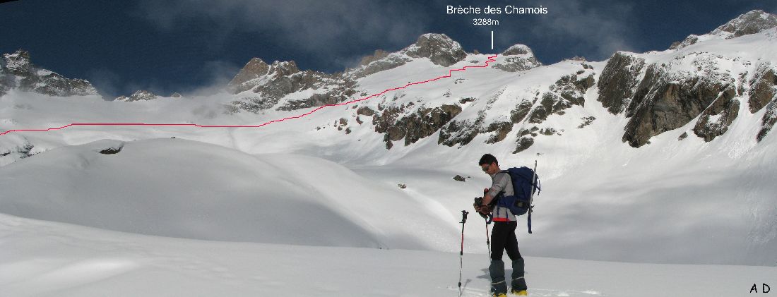 Tout en haut, la brèche des Chamois, enchâssée entre le pic Emma et la pointe des Chamois.