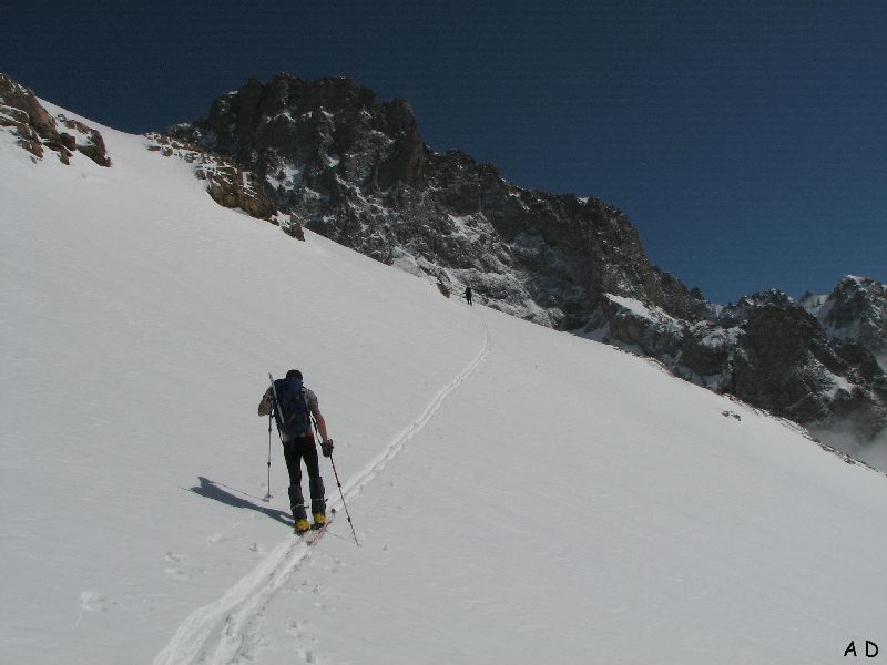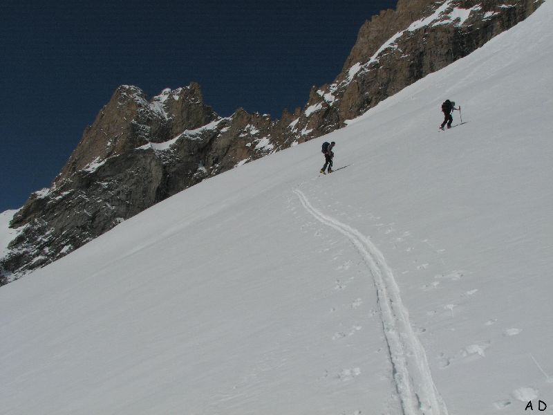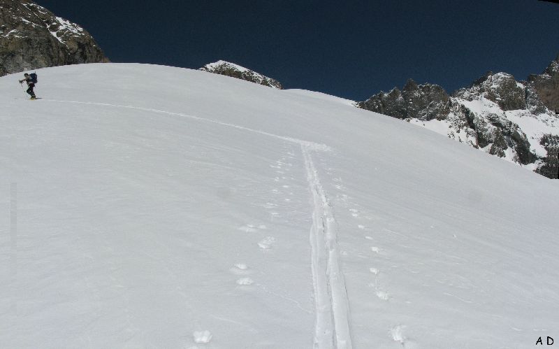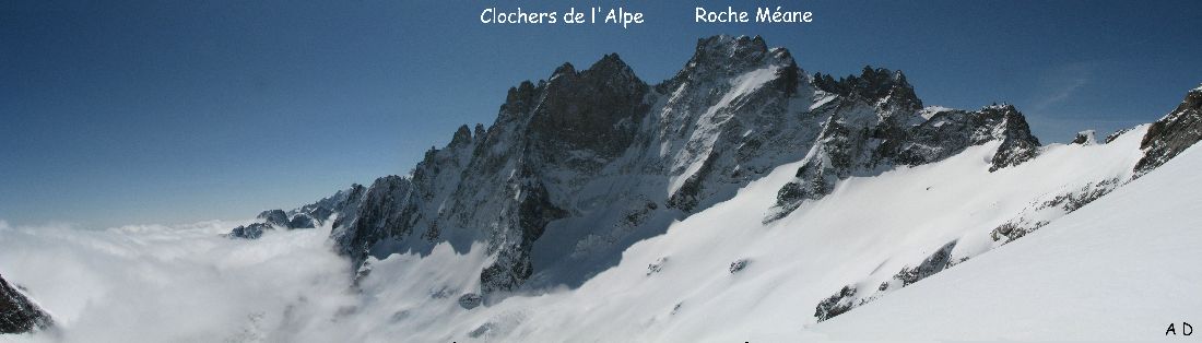 En fond de vallée, la mer de nuage avec les Clochers de l'Alpe et Roche Méane 3726m qui cache la Grande Ruine.