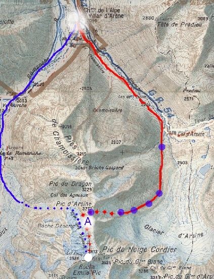 (A) 3251m sur la carte est atteint, il neige abondamment, nous