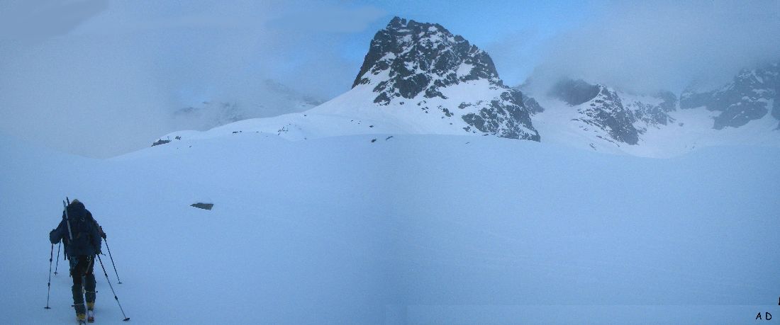 Côte 2503m au dessus du col d'Arsine, à droite sous le 1er pic, le Glacier du Rif de la Planche, le col des Agneaux (3155m), et à droite la brèche Gaspard (3048m) (Cliquer sur la photo pour afficher la légende)
