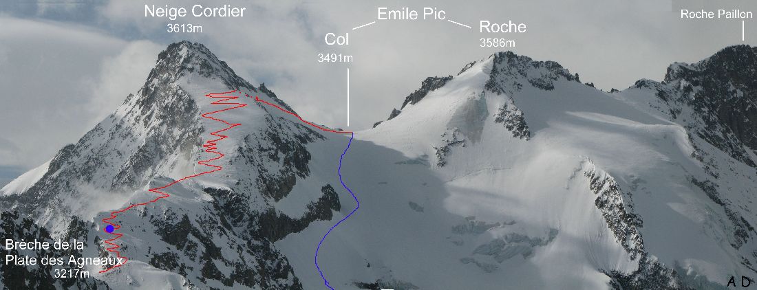 Le pic Neige Cordier, le col et le pic Emile Pic avec le glacier des Agneaux. Le point bleu correspond au point de retour... L'itinéraire est repéré, peut-être pour une prochaine avec au programme : Refuge de l'Alpe - col Emile Pic - refuge des Ecrins - Roche Faurio - refuge des Ecrins - col Emile Pic - glacier des Agneaux - Plan de Valfourche - refuge de l'Alpe.... (Cliquer sur la photo pour retirer la légende) |