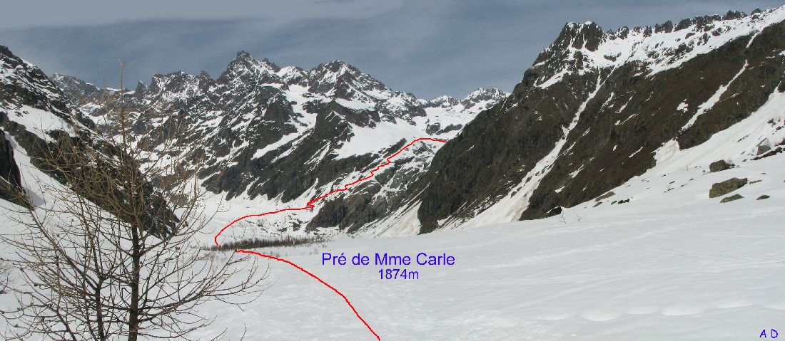 Pré de Mme Carle en fond. Au dessus de l'espace boisé à droite, la montée vers le Glacier et le refuge du Glacier Blanc.   (Cliquer sur la photo pour afficher la légende)