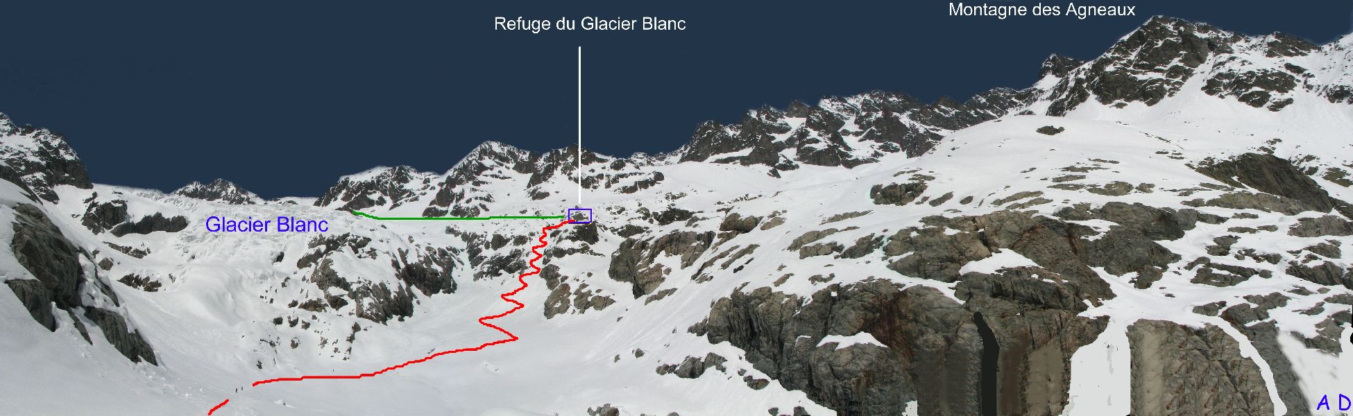 Le front du Glacier blanc devant nous et le refuge sur un des pitons rocheux.