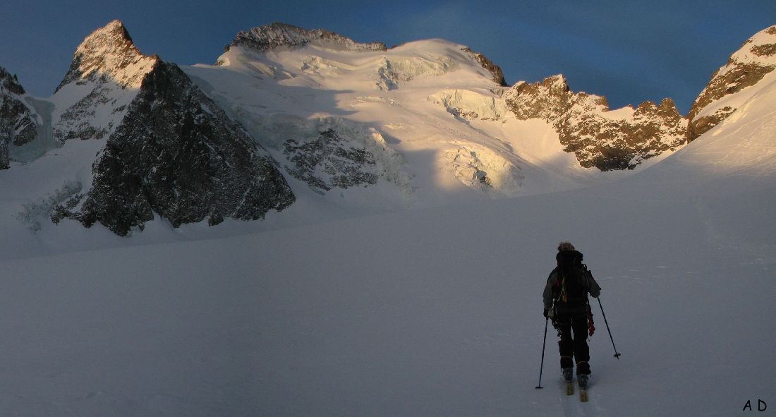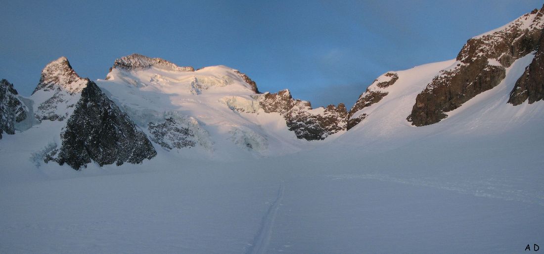 6h40. Barre Noire 3751m, Barre des Écrins 4102m et Dôme des Écrins 4015m (Cliquer sur la photo pour afficher la légende)