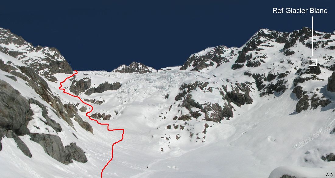 Le passage de la rive droite vu du plateau sous le refuge de Glacier Blanc.