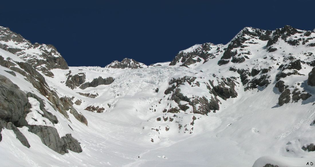 Le passage de la rive droite vu du plateau sous le refuge de Glacier Blanc.