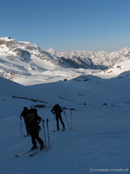 A la limite ombre soleil, le refuge, nous mettons les couteaux aux skis avant d'attaquer les difficultés car après cela serait plutôt délicat. La température est de -11°C. Neige dure