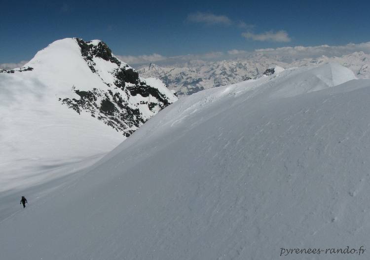 La montée à la pointe Mathews est agréable dans une neige froide et poudreuse avec la Grande Casse en arrière plan.