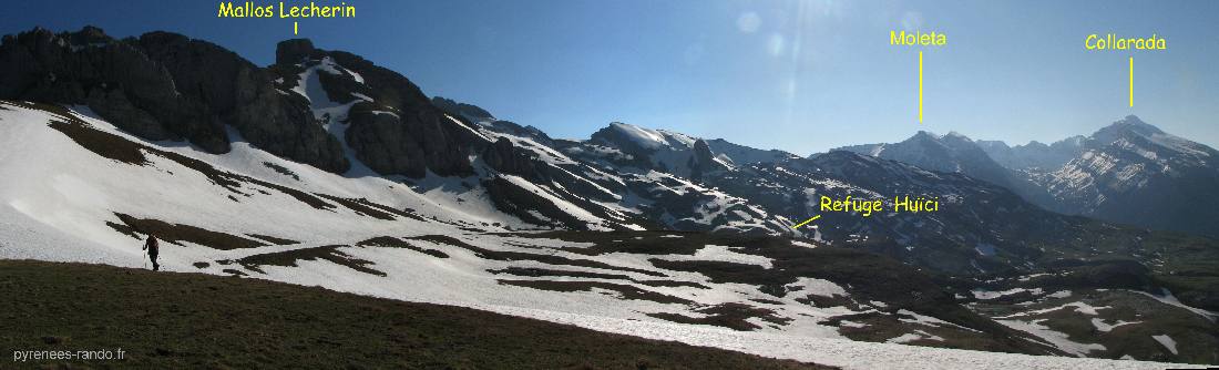 Lorsque l'on bascule sur le versant sud du col de Magdalena, changement de panorama : Mallos de Lecherin, Moleta, Peņa Collarada et tout proche le refuge de Huici.