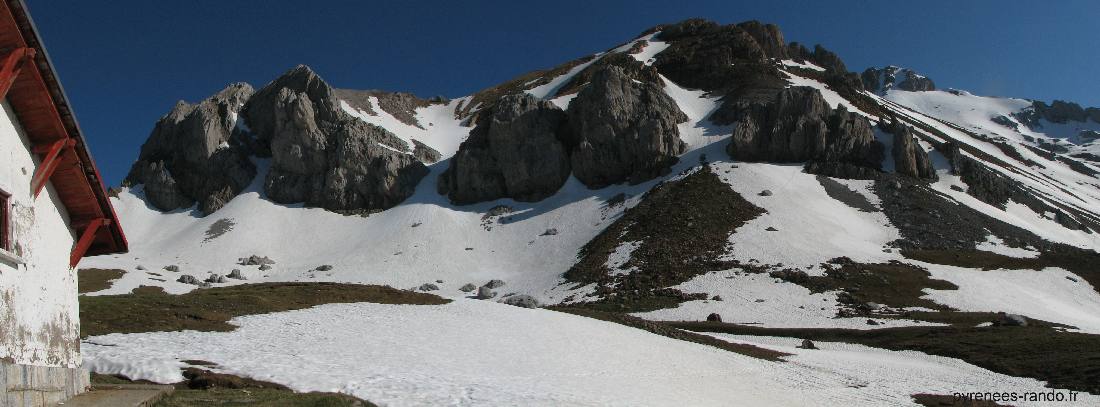 Refuge de Huici et tout en haut, notre objectif du jour, le pico de la Garganta de Borau avec ses deux couloirs en neige.