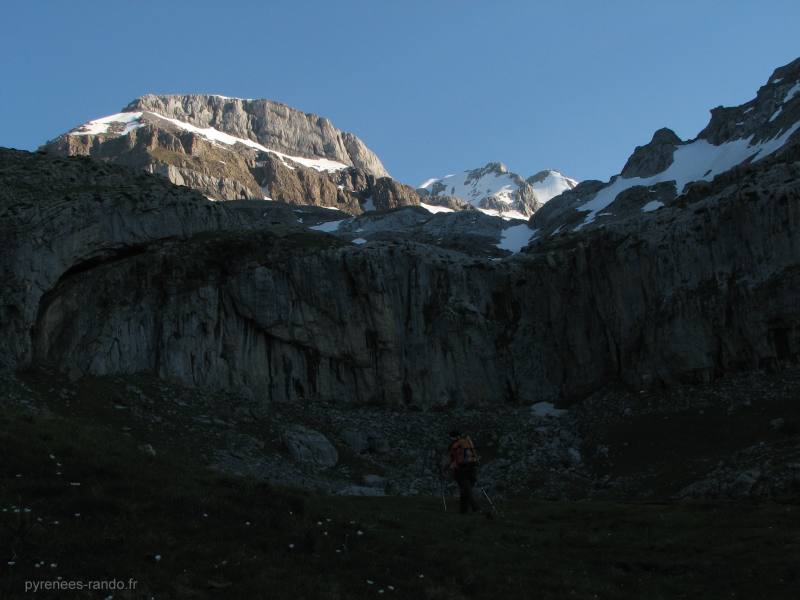 Au fond du plateau, nous butons sur une barre rocheuse calcaire que l'on évitera par l'ouest. En fond de gauche à droite : punta alta de Napazal, Ruabe de Bernera, pico de Olibon.