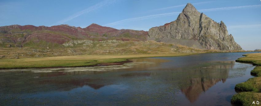 Plateau et lac d'Anayet 2237m dominé par le Vertice d'Anayet 2559m et le pic d'Anayet 2545m qui est moins élevé que le Vertice (apparence trompeuse) (Cliquez sur la photo pour afficher l'itinéraire) |