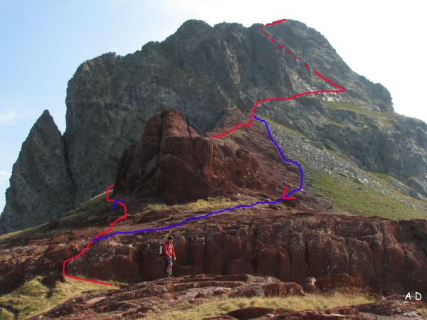 Le premier ressaut franchi, "une proue de navire rouge" nous domine. Je vous propose de passer à gauche pour la montée et descendre par le flanc opposé (Cliquez sur la photo pour retirer la légende) |