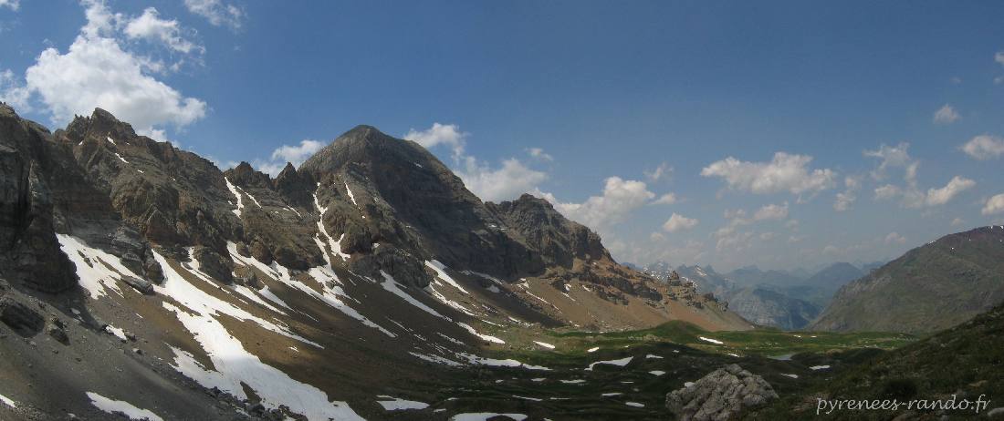Col d'Escarra, au sud, S-E le cirque de Gavarnie (Marboré, Mt Perdu) et la sierra Tendenera.