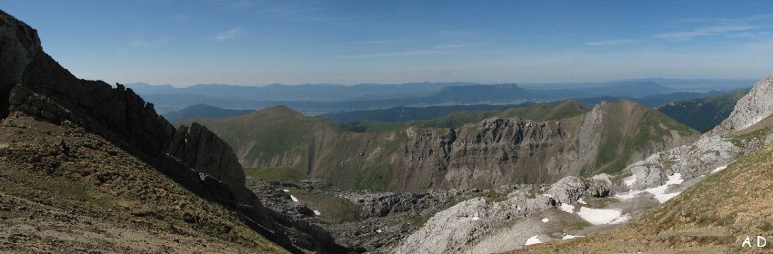 Au débouché du col, le val de Plan d'Usabas et le Mont Oroel