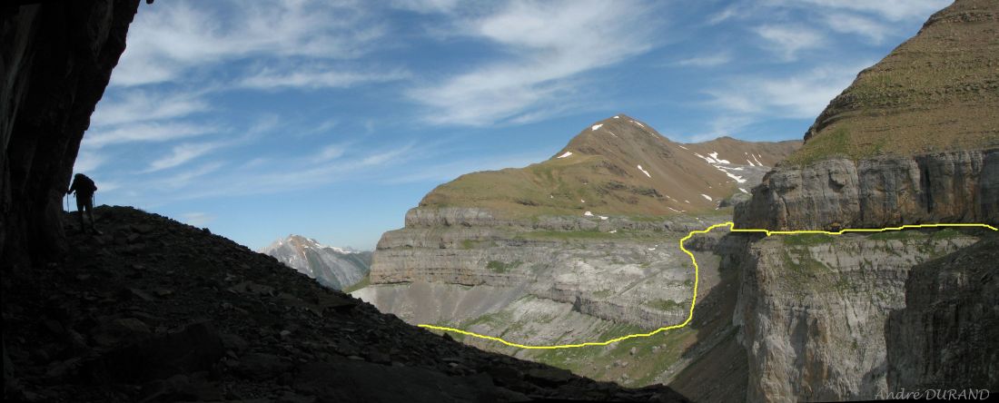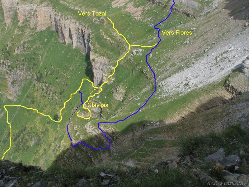 Le cirque de Carriata et ses sentiers depuis la vire de las Flores (Le bleu évite les clavijas, mais reste aérien).