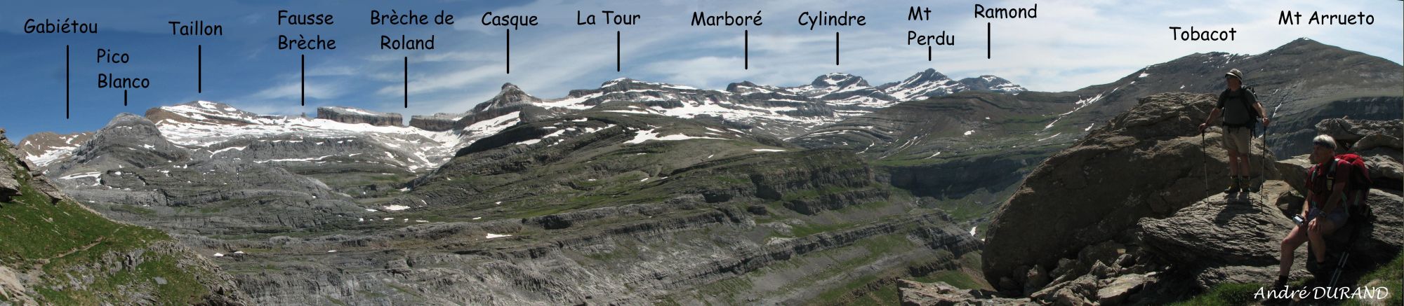 L'envers du cirque du Gavarnie : Cabiétou, pico Blanco, Taillon, brèche de Roland, Casque, La Tour, Marboré, Cylindre, Mt Perdu, Ranond, Tobacot, Mt Arrueto.