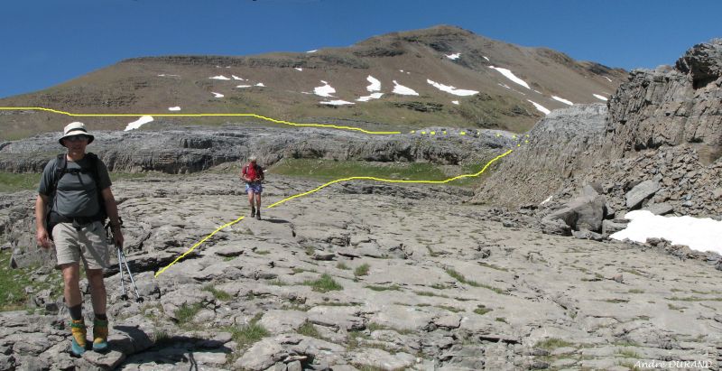 La descente de la vire se fait en suivant les cairns qui vous mèneront à travers les lapiaz au rio de Cotatuero.