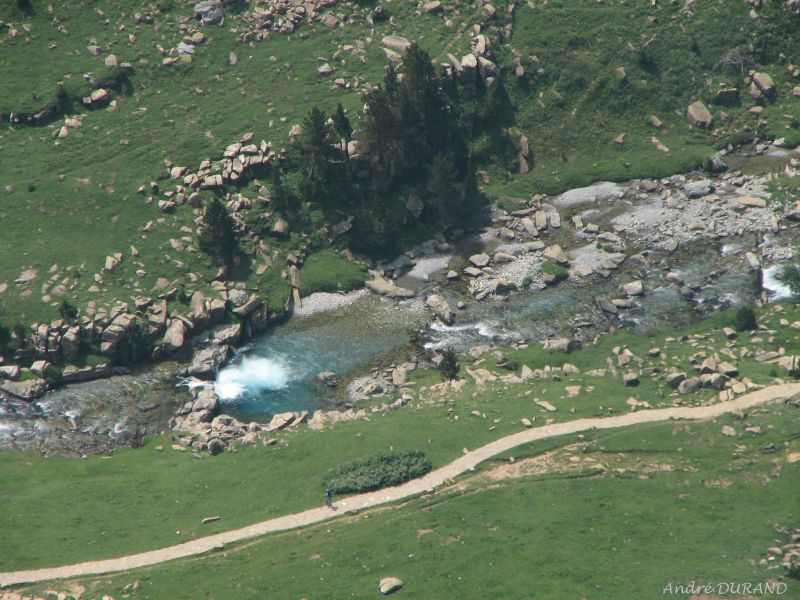 En s'approchant du bord, le chemin en fond de canyon avec les cascades des Gradas de Soaso