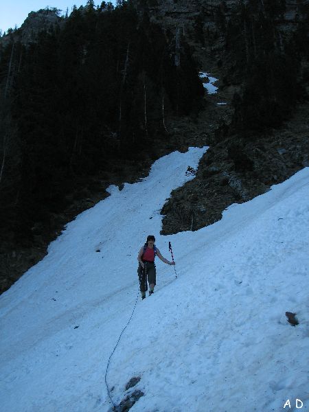 En cette saison, 50m après le panneau, il faut traverser un couloir qui demande vigilance en raison de la pente et du "gaz" en dessous qui mène directement à la Pradera. Une petite corde peut rassurer sa compagne