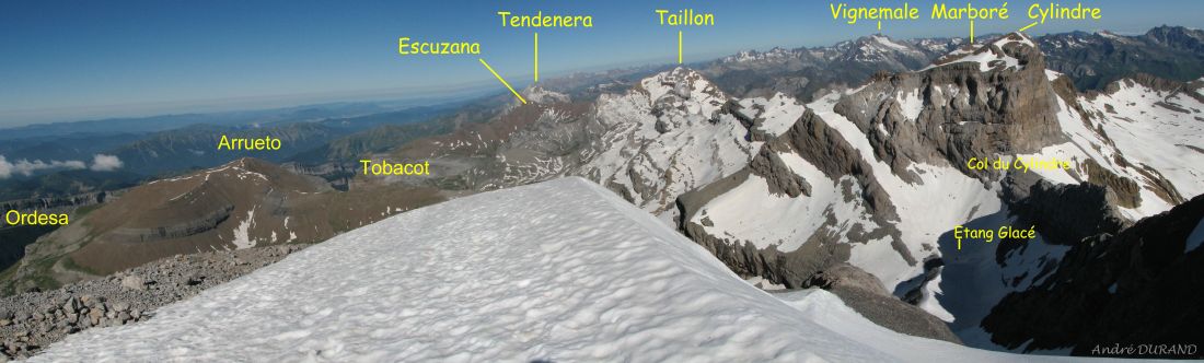 A l'Ouest : Arrueto, Tobacot, Escuzana, Taillon, Vignemale, Marboré, Cylindre, col du Cylindre et au pied, l'Étang Glacé.