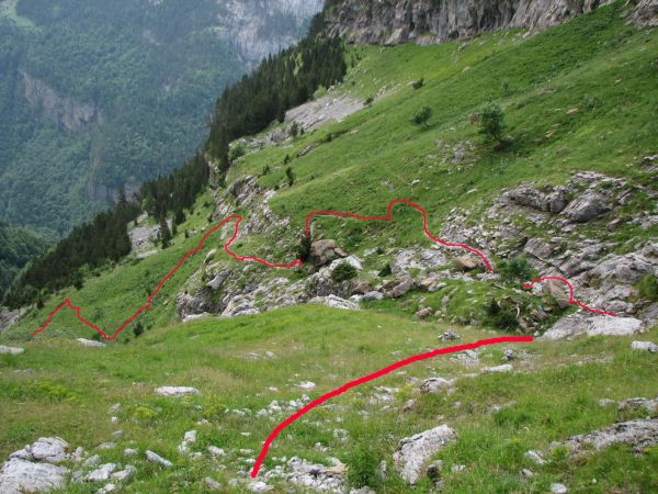 A la sortie du bois, la sente emprunte la rive droite du torrent (à sec) et ...