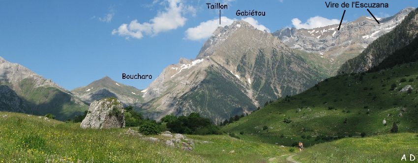 .Si l'on se retourne, pic entre les Ports à gauche du col de Boucharo, et à droite, le Gabiètou, la vire et le pic de l'Escuzana