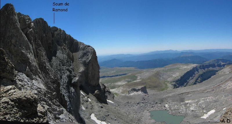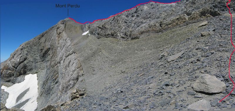 La crête du Soum de Ramond nous montre son profil. Les difficultés sont entre la pointe du fond et le col du Mont Perdu