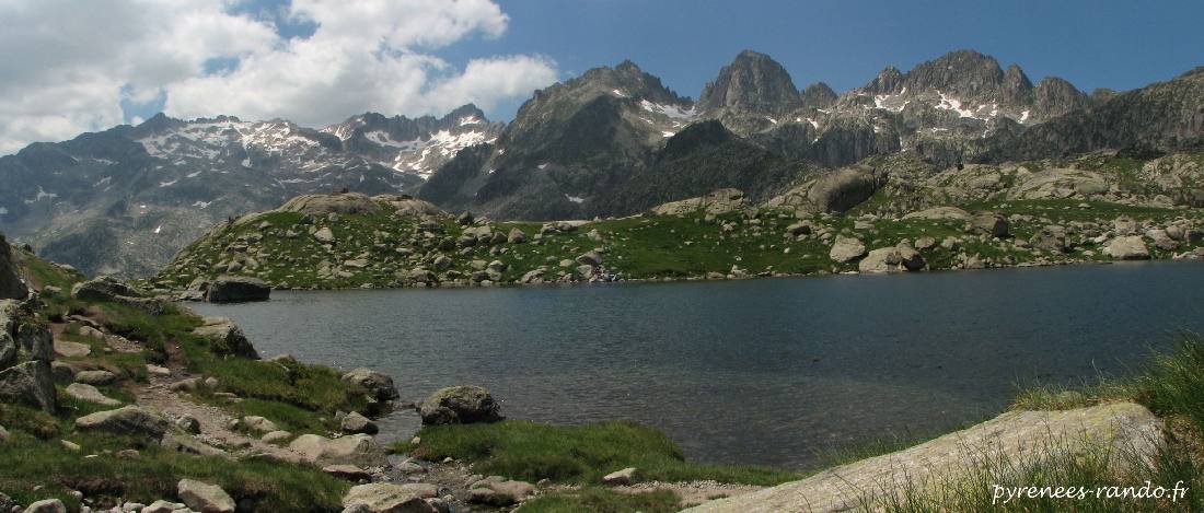 Depuis l'étang de Traverssani 2260m, à l'approche du refuge de Ventosa, avec le massif du Besiberri (partie gauche) et la sierra de Tumeneia (punta d'Harlé 2882m, el Pa de Sucre 2864m, Tumeneia 2784m).