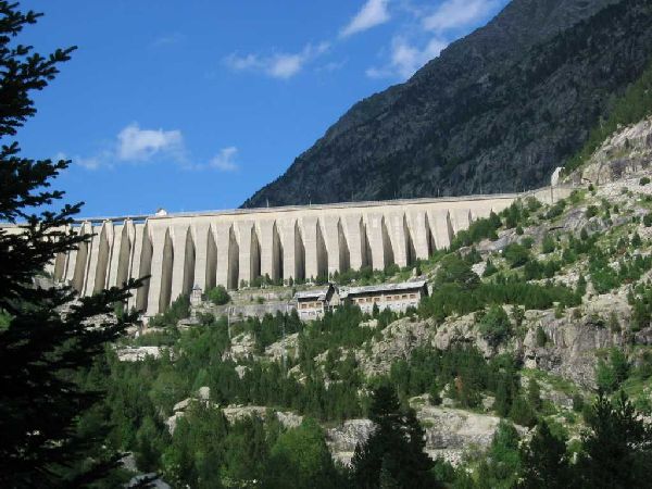 La muraille du barrage de Cavallers ferme la vallée de Caldes.