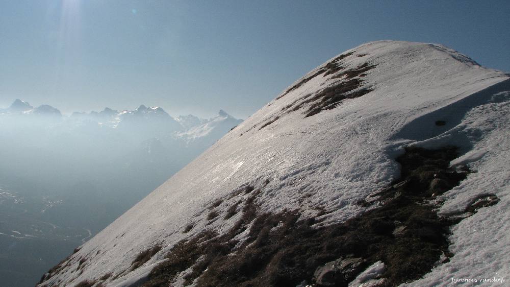 Arrivée sur la crête du Keleta. Les derniers 50m sont raides sur de l'herbe/neige mêlée.