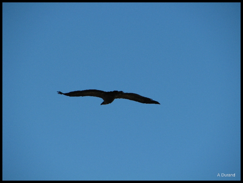 Un vautour survole les pâturages déserts à la cherche de nourriture.