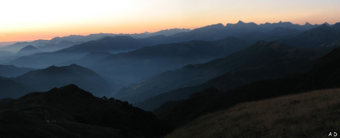 6h40, le jour se lève sur la vallée, dont on aperçoit les lumières du village de Larrau
