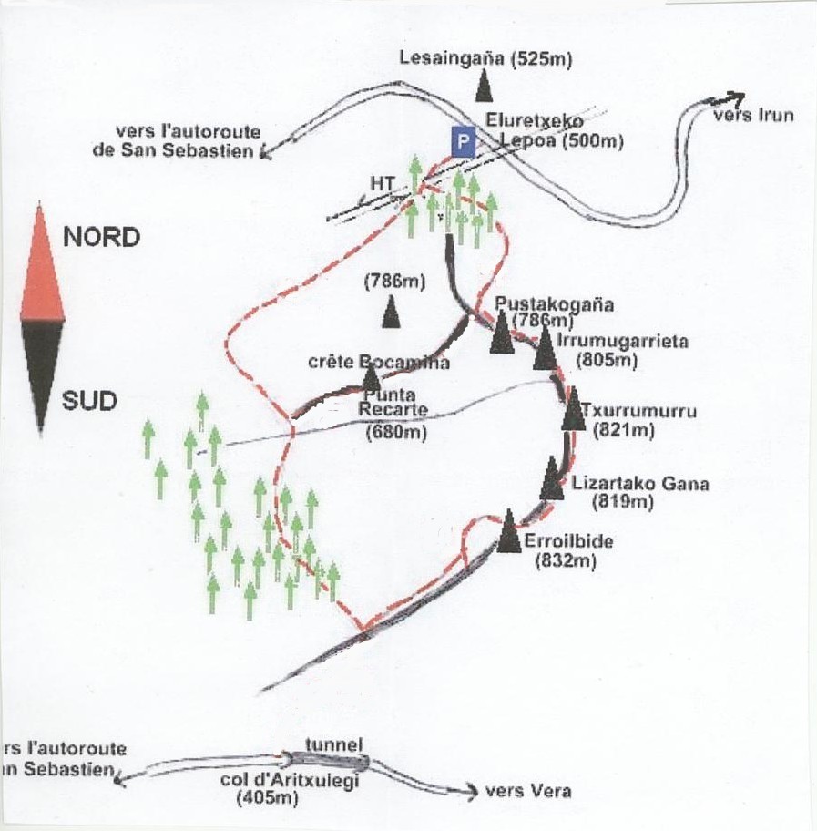 gauche . Suivre la route qui monte jusqu'au col d'Eluretxe(498m) et