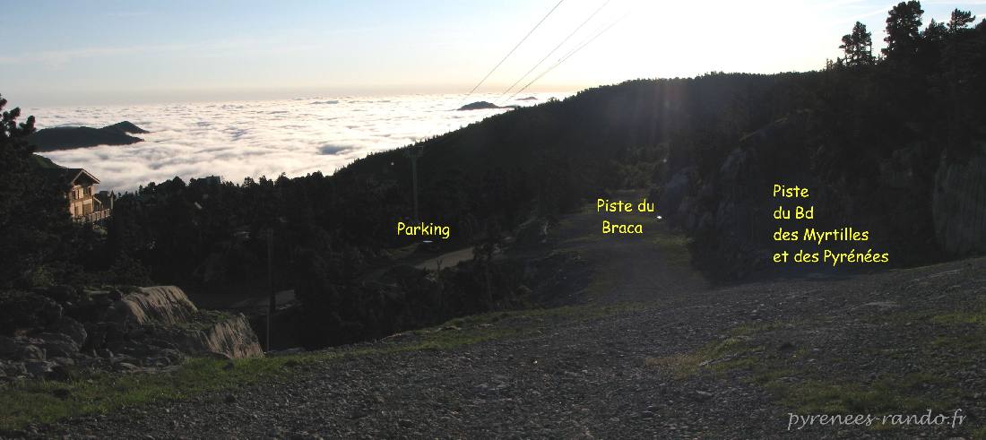 Point de départ aux chalets, mer de nuage, contre jour, jeux de lumières. A la croisée des routes et des pistes (route des chalets, pistes du Braca, des Bd des Myrtilles et des Pyrénées, et retour station)