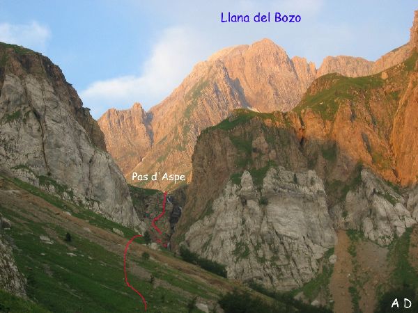 A l'approche du pas d'Aspe quitter le GR11 (Cairn) pour prendre la sente qui mène au pied du pas ~1700m. Traverser le ruisseau au pied de la cascade, grimper une vingtaine de mètres, et traverser à nouveau pour attraper un replat qui permet de prendre une vire ascendante qui vous conduira au sommet du pas d'Aspe. Quelques pas de II, l'ambiance matinale est austère...