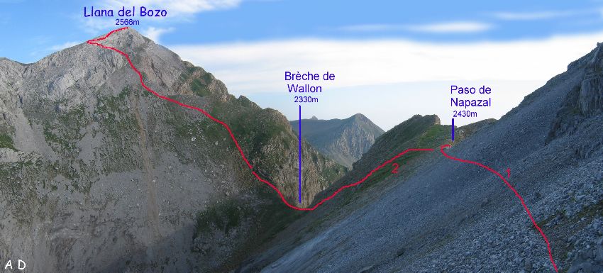 (1) A la sortie du Paso de Napazal, une sente (1) part à flanc sur la gauche, et quelques cairns indiquent l'accès...