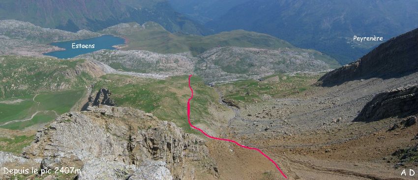 Lac d'Estaëns, Peyrenère et la voie de descente sur la croupe plein nord qui rejoint le chemin de la vallée d'Olibon au niveau des rochers blancs.