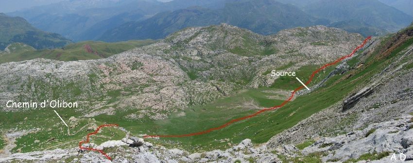 Au bout à droite du plateau, le puerto d'Estaëns permet de rejoindre le GR11 qui arrive du Turonet des Curets et de retrouver de l'eau dans la gorge creusée dans la barre rocheuse calcaire (je n'ai pas rencontré d'eau depuis le vallon du Pas d'Aspe).